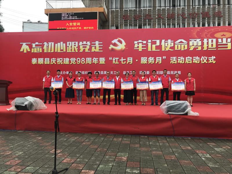 為隆重紀(jì)念中國(guó)共產(chǎn)黨成立98周年,充分發(fā)揮基層黨組織的戰(zhàn)斗堡壘作用和共產(chǎn)黨員的先鋒模范作用,7月2日上午,泰順縣委組織部、縣直機(jī)關(guān)工委、總工會(huì)、團(tuán)縣委、縣婦聯(lián)、縣民政局等單位在縣文化廣場(chǎng)隆重舉行慶祝建黨98周年暨不忘初心跟黨走、牢記使命勇?lián)?dāng)“紅七月·服務(wù)月”啟動(dòng)儀式。