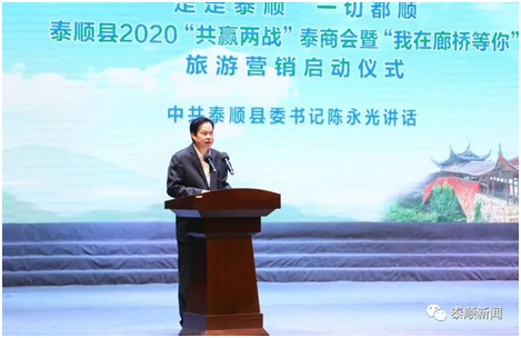 4月3日上午,泰順縣委、縣政府在影劇院舉行“走走泰順一切都順”泰順縣2020“共贏兩戰(zhàn)”泰商會暨“我在廊橋等你”旅游營銷啟動儀式,內(nèi)外泰順人“云上”“云下”如約相聚,共敘鄉(xiāng)愁、共戰(zhàn)疫情、共謀發(fā)展。縣委書記陳永光出席會議并作講話。全國工商聯(lián)五金機電商會會長、億聯(lián)控股集團董事長嚴立淼出席會議并作發(fā)言??h委副書記、縣長王慧杰主持儀式??h人大主任胡榮登、縣政協(xié)主席盧嫦、縣委常委雷全勉、胡慧雷、童德平、副縣長楊明明出席儀式,振泰建設股份有限公司董事長/總經(jīng)理、縣青年(新生代企業(yè)家聯(lián)誼會)會長葉圣歡參加會議并上臺領取“感謝信”。