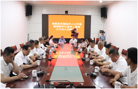當日下午,在泗溪鎮(zhèn)政府會議室召開“泰順縣民營經濟人士開展激揚新時代溫州人精神大討論大實踐活動”。就如何引導廣大民營經濟人士深刻理解“溫州人精神”豐富而生動的時代內涵,如何深化“兩個健康”工作展開了交流和討論,并分別講述了企業(yè)當前所遇到的困難與未來的發(fā)展期望,對政企之間的工作提出了建議。