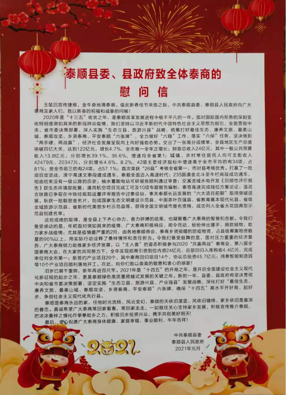 2020年是泰順改革發(fā)展進(jìn)程中極不平凡的一年,也是“十三五”收官之年。全縣上下齊心協(xié)力、奮力拼搏,經(jīng)濟(jì)社會(huì)發(fā)展呈現(xiàn)向上向好強(qiáng)勁態(tài)勢(shì),交出了一張高分成績(jī)單,其中凝聚著廣大泰商的智慧和貢獻(xiàn)。