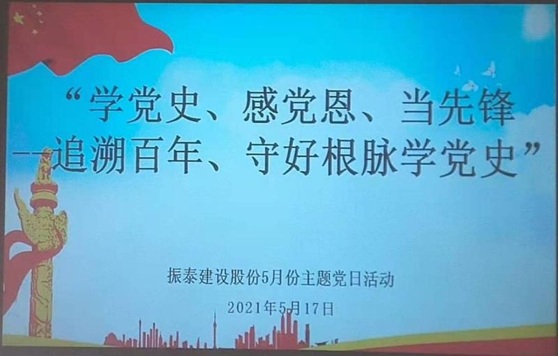 根據(jù)上級統(tǒng)一部署,振泰建設(shè)股份有限公司黨支部于5月17日下午在公司黨員活動室召開以“學(xué)黨史、感黨恩、當先鋒——追溯百年,守好根脈學(xué)黨史”為主題的黨日活動,在泰的全體黨員、入黨積極分子、員工參加。