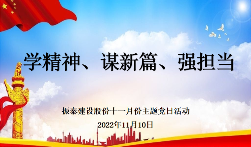 根據(jù)縣委組織部統(tǒng)一部署,振泰建設股份有限公司黨組織于11月10日下午在公司黨員活動室召開以“學精神、謀新篇、強擔當”為主題的黨日活動,在泰的黨員、管理層、入黨積極分子參加。