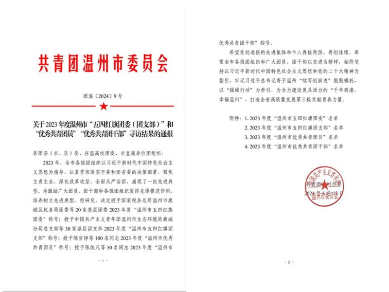 毛達(dá)龍宣讀了《關(guān)于2023年度溫州市“五四紅旗團(tuán)委<團(tuán)支部>”和“優(yōu)秀共青團(tuán)員”“優(yōu)秀共青團(tuán)干部”尋訪結(jié)果的通報(bào)》(團(tuán)溫﹝2024﹞9號(hào))文件,振泰建設(shè)股份有限公司團(tuán)支部獲得2023年度“溫州市五四紅旗團(tuán)支部”稱(chēng)號(hào)。