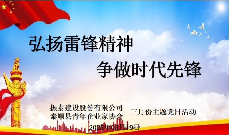 根據(jù)上級(jí)黨組織部署,振泰建設(shè)股份有限公司黨支部、泰順縣青年企業(yè)家協(xié)會(huì)(簡(jiǎn)稱:青企協(xié))黨支部聯(lián)合于3月19日下午在公司黨員活動(dòng)室召開以“弘揚(yáng)雷鋒精神 爭(zhēng)做時(shí)代先鋒”為主題的黨日活動(dòng),在泰的黨員、入黨積極分子參加。