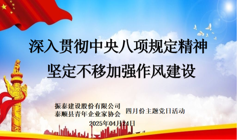 根據(jù)上級黨組織部署,振泰建設(shè)股份有限公司黨支部、泰順縣青年企業(yè)家協(xié)會(簡稱:青企協(xié))黨支部聯(lián)合于4月24日下午在公司黨員活動室召開以“深入貫徹中央八項規(guī)定精神 堅定不移加強作風(fēng)建設(shè)”為主題的黨日活動,在泰的、線上的黨員、入黨積極分子參加。