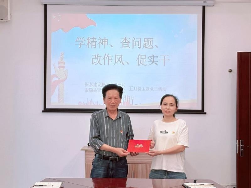 根據(jù)上級黨組織部署,振泰建設(shè)股份有限公司黨支部、泰順縣青年企業(yè)家協(xié)會(簡稱:青企協(xié))黨支部聯(lián)合于5月21日下午在公司黨員活動室召開以“學(xué)精神、查問題、改作風(fēng)、促實(shí)干”為主題的黨日活動,在泰的、線上的黨員、入黨積極分子參加。